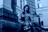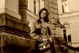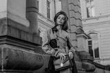 Outdoor autumn fashion portrait of young elegant woman wearing beige black trench coat, beret, with green faux leather textured crocodile shoulder bag, posing in street. Copy, empty space for text