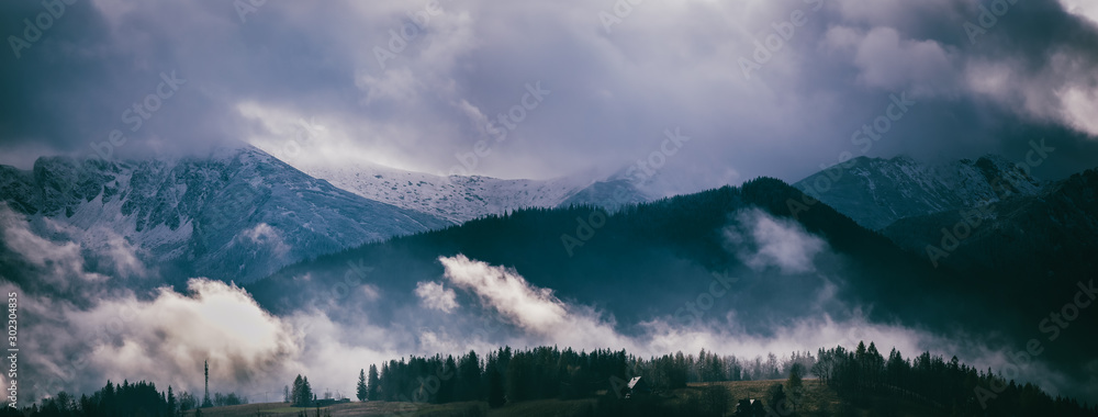 Panorama HDR of the Tatra Mountains and Zakopane in Poland, National Park, pictures taken in cloudy day.