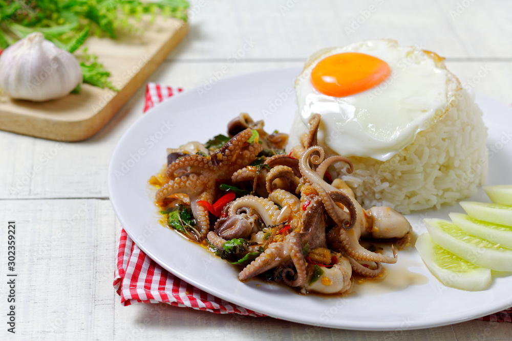 Rice topped with stir-fried Octopus dollfusi and basil with Sunny side up egg.Thai food