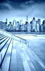 Black and white picture of Manhattan skyline seen from Roosevelt Island, New York City, USA.