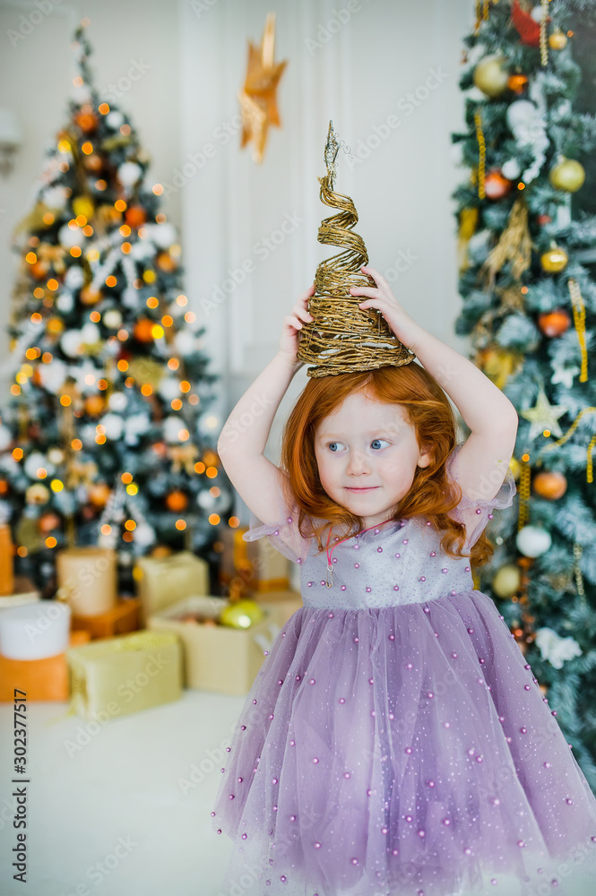 Funny beautiful little angel girl with gold pyramid on head looking aside and stand near fashionable New Year's scenery