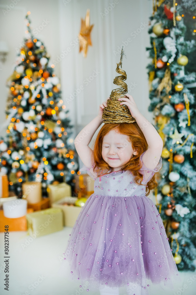 The little red-haired girl with gold pyramid on head near fashionable New Year's scenery