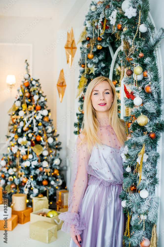 Blonde woman in evening violet dress standing near fir tree with gifts. New Year eve