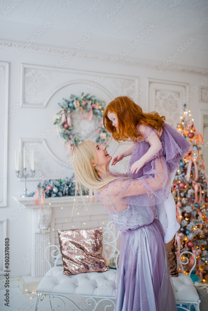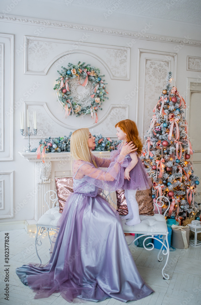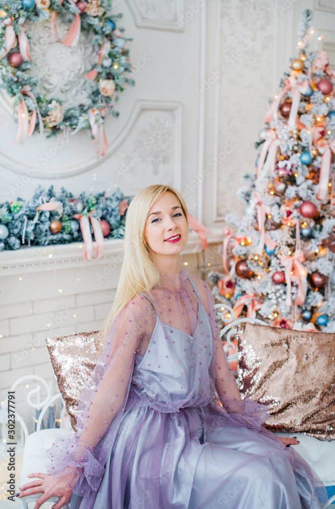 Beautiful woman sitting on the bench against christmas interior background. Closeup portrait
