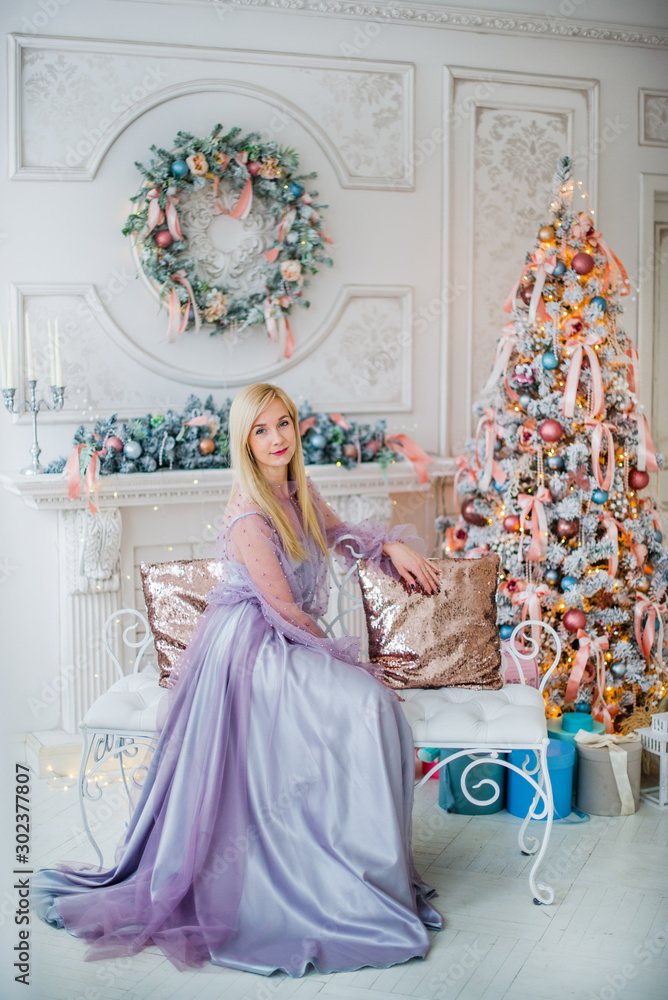 Beautiful woman sitting on the bench against christmas interior background.