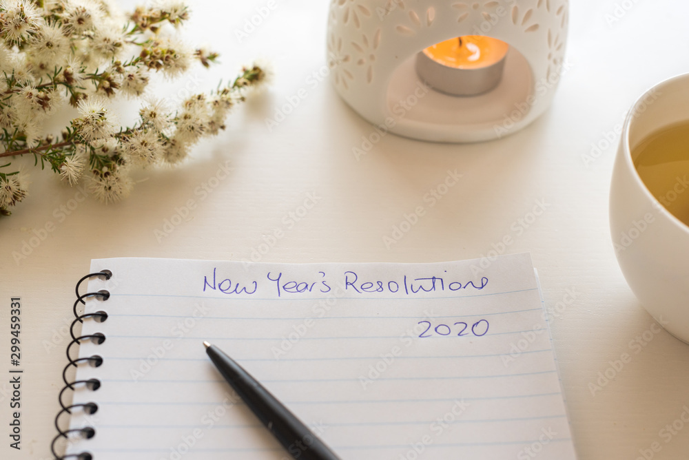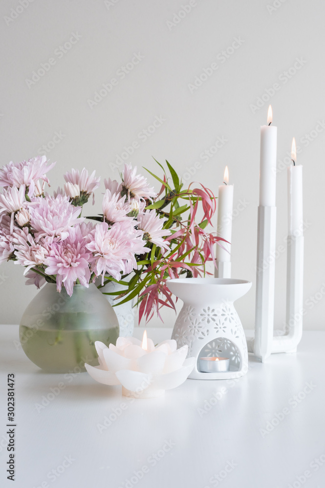 Vertical view of pink chrysanthemums, white candles and oil burner on white table against neutral wall background on table (selective focus)
