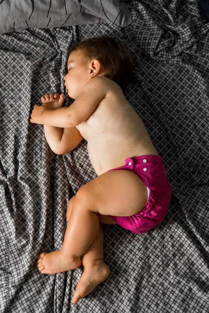 Sleeping baby with cloth diaper. Top view. Ecology reusable organic diaper. Copy space