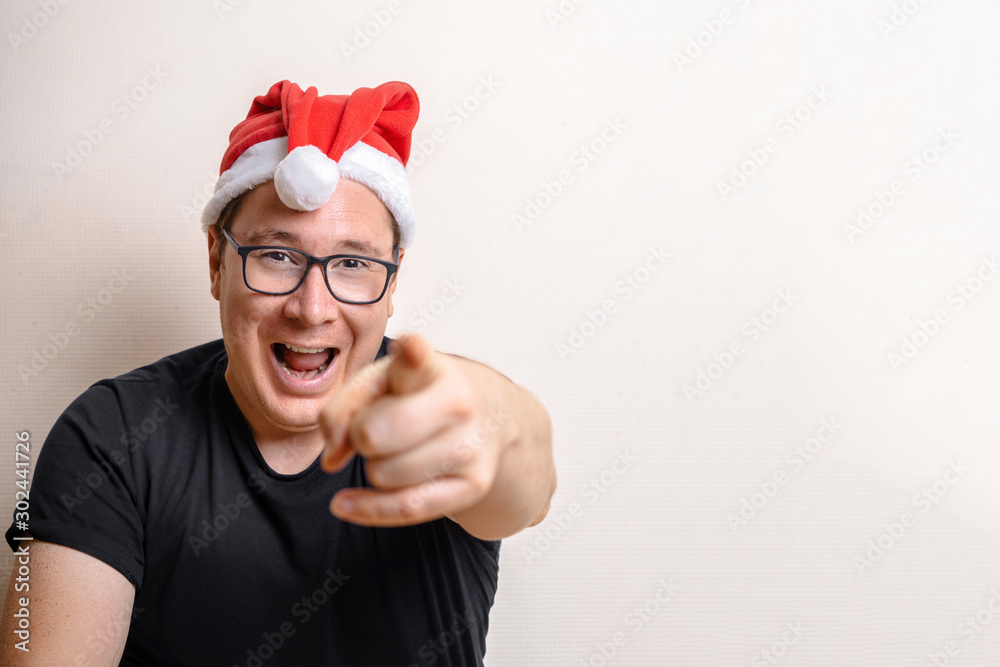 smiling man in santa hat pointing with fingers at camera isolated on red