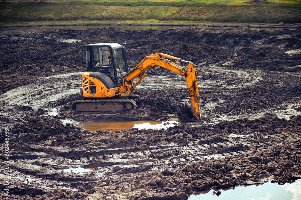 An excavator is standing in the mud. Cleaning the drained pond from dirt and debris.
