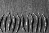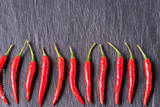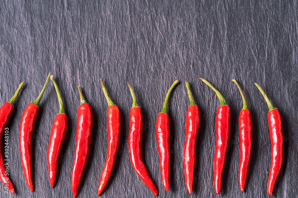 red fresh chili peppers pattern on black background.