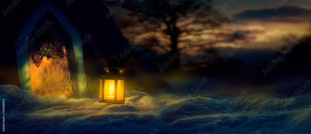 A festive Christmas scene of a wooden door and wreath in the warm glow of a lantern with snow on the ground.