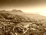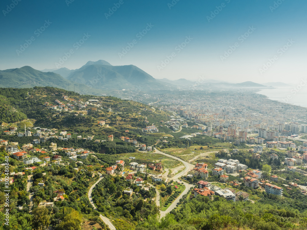 Alanya, Turkey. Beautiful panoramic top view of the city of Alanya and the Mediterranean Sea from the mountain. Vacation postcard background
