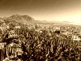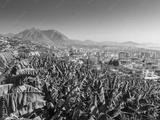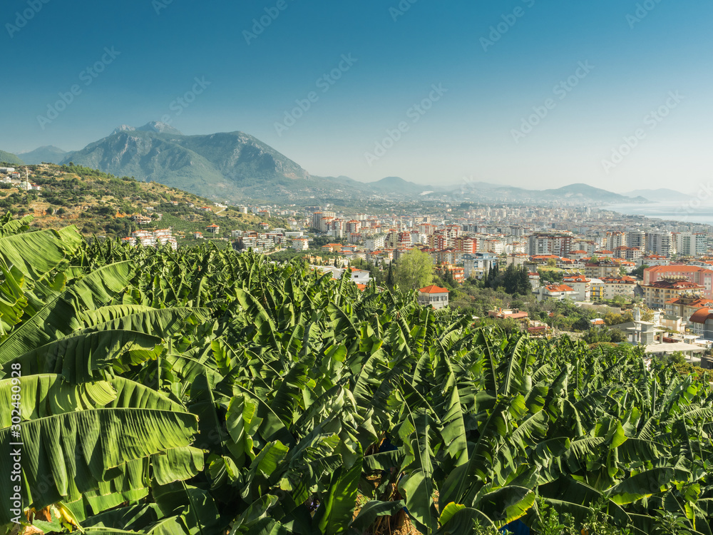 Alanya, Turkey. Beautiful panoramic top view of the city of Alanya and the Mediterranean Sea from the mountain. Banana palm in the foreground. Vacation postcard background