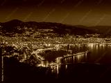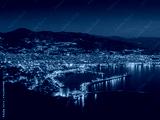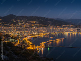 Alanya, Turkey. Beautiful night panoramic top view of the city Alanya, the Mediterranean Sea, the red tower, the lighthouse from the fortress Alanya Castle. Vacation postcard background