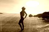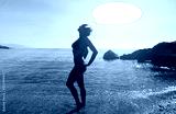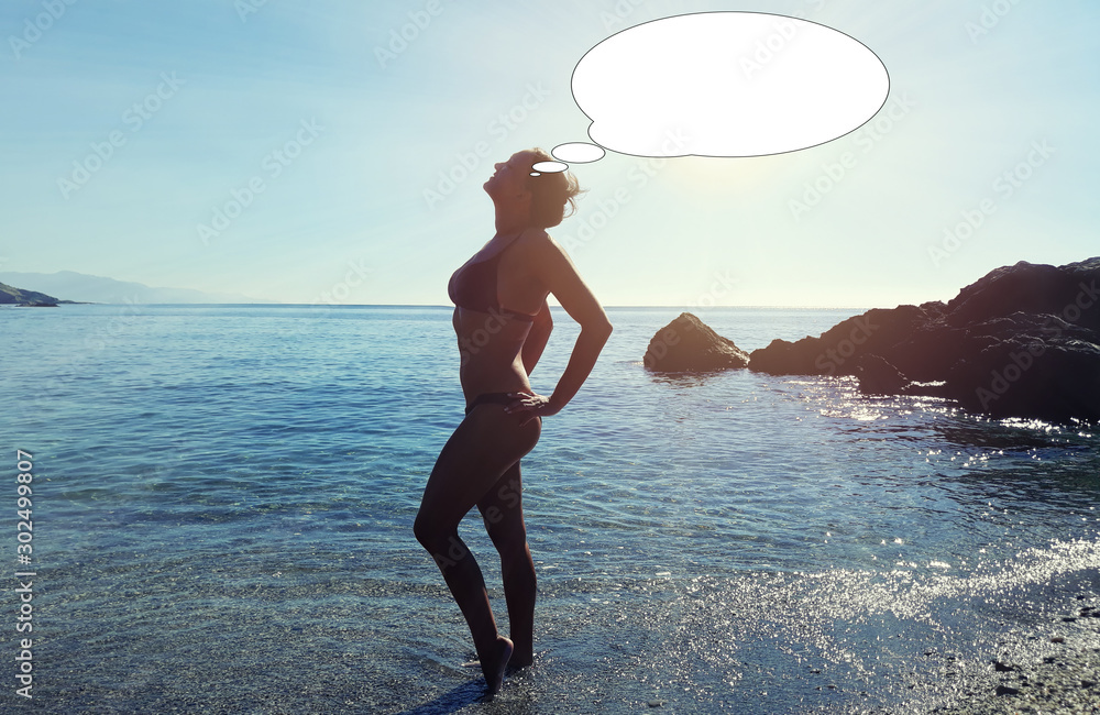 Funny picture with bubble idea woman on the beach in bikinis.