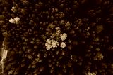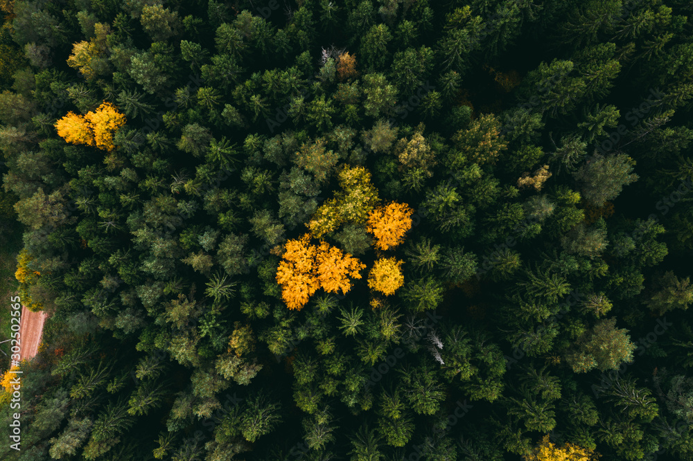Autumn forest aerial view. Colorful trees from above. Fall scene. Yellow tree in green pine forest. Beautiful autumn landscape