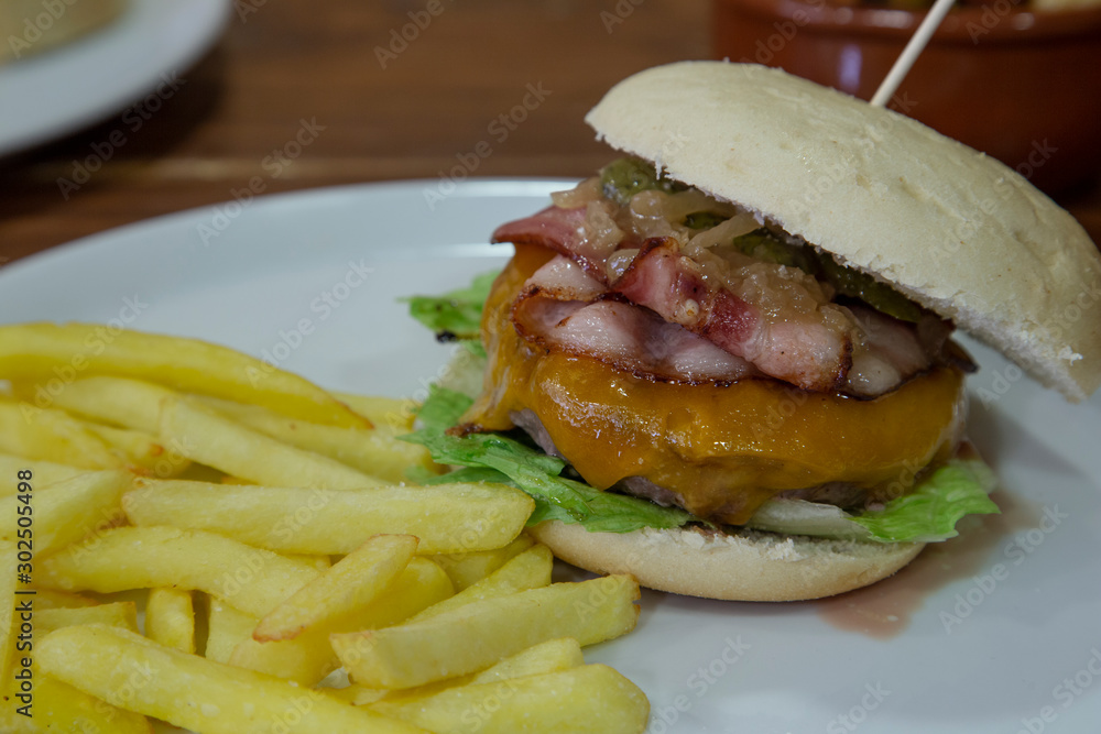 Isolated image of veal burger with french fries served on white plate on wooden background