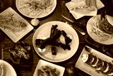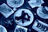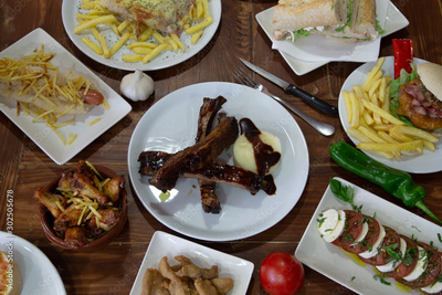 Wide variety of Mediterranean food presented on the common wooden table. image taken from above