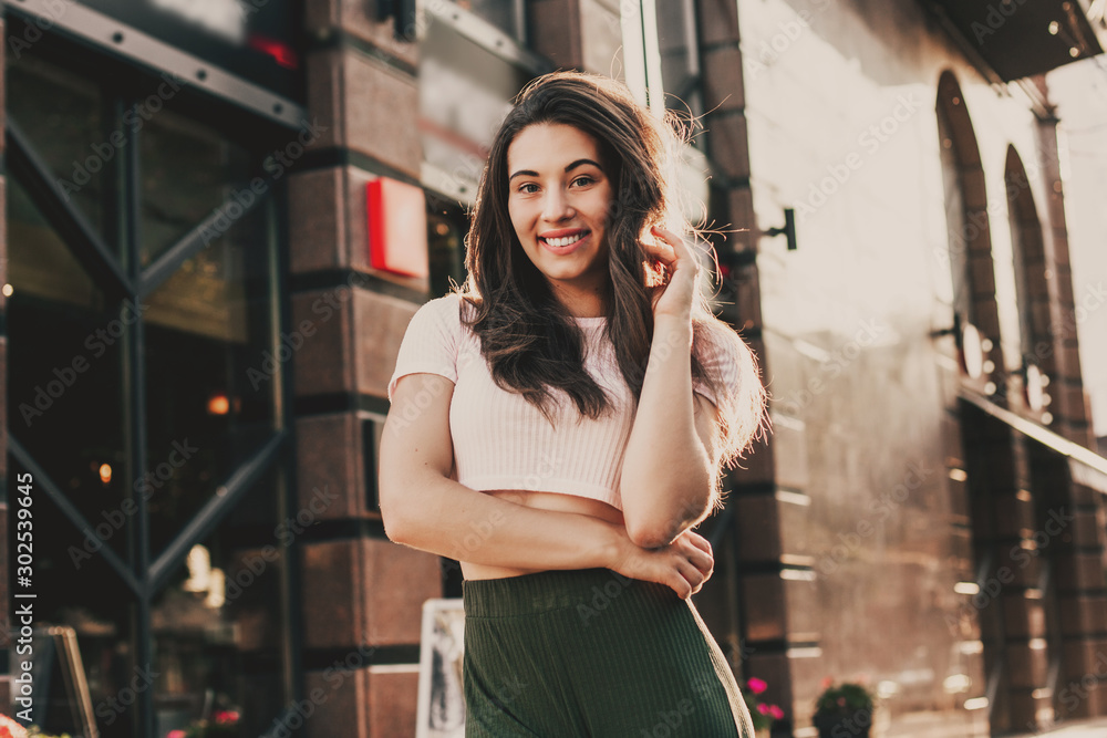 Smiling woman walk in the city on summer day.