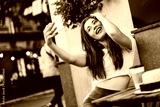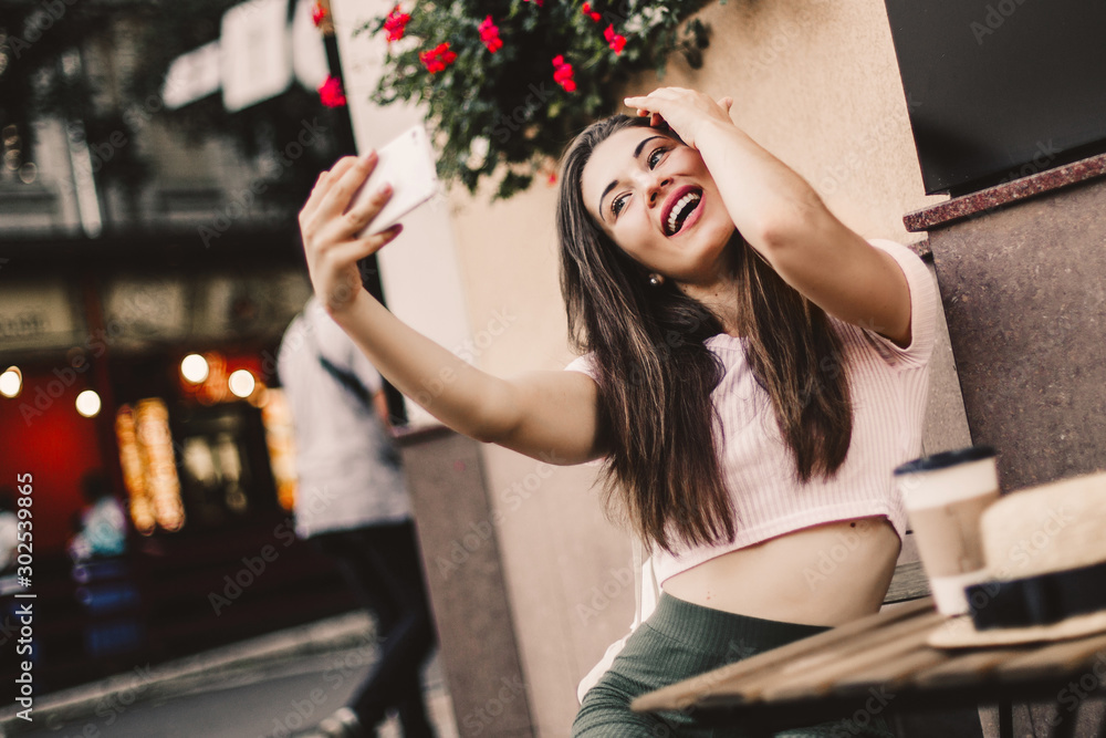 Beautiful woman using phone and drink coffee sitting on street cafe.