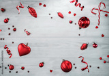 Merry Christmas and New Year background. Xmas holiday card made of flying decorations, fir branches, red balls, snowflakes, sparkles, bokeh, light on wooden background. Selective focus