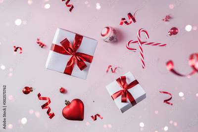 Merry Christmas and New Year background. Xmas holiday card made of flying decorations, red balls, snowflakes, sparkles, gift boxes, bokeh, light on pink background. Selective focus