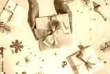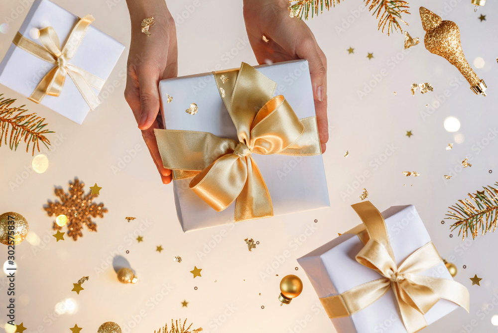 Female hands holding gold gift box on light golden background with flying Christmas decorations, fir branches, balls, sparkles and confetti. Xmas and New Year holiday, bokeh, light. Selective focus