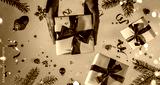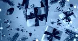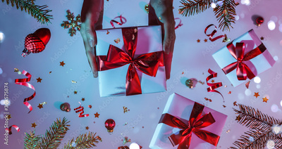 Female hands holding gift box on colorful bright neon blue and purple background with flying Christmas decorations, fir branches and confetti. Xmas and New Year holiday, bokeh, light. Selective focus