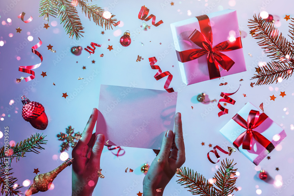Female hands holding a letter to Santa on colorful bright neon blue and purple background with flying Christmas decorations, gift boxes, sparkles and confetti. Xmas and New Year holiday, bokeh, light