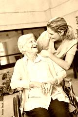 Glückliche Seniorin im Rollstuhl mit Pflegekraft