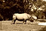 A white rhinoceros staying in grassland with green trees in background.