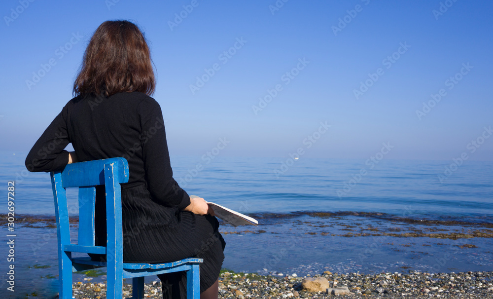 Young woman sitting on chair, holding a book and lookining distant on beach. Relaxation, resting vacations, cultural activity concept. Leisure time in summer. Freedom, information, knowledge concept.