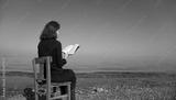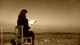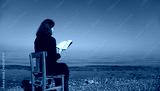 Young lonely woman sitting on chair, reading book on beach. Relaxation, resting vacations, cultural activity concept. Leisure time in summer. Freedom, information, knowledge concept. Freelance reader.