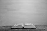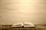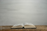 Open Holy Bible on a old wooden table and white wall background. Religion concept.