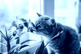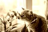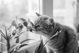 Ginger cat smelling dendrobium orchid walking on window sill at home. Curious pet
