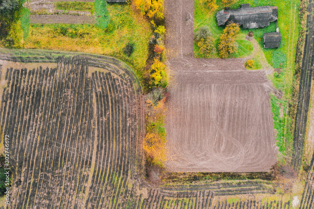 Aerial drone view from above of field after harvest, forest and farmland in autumn sunset