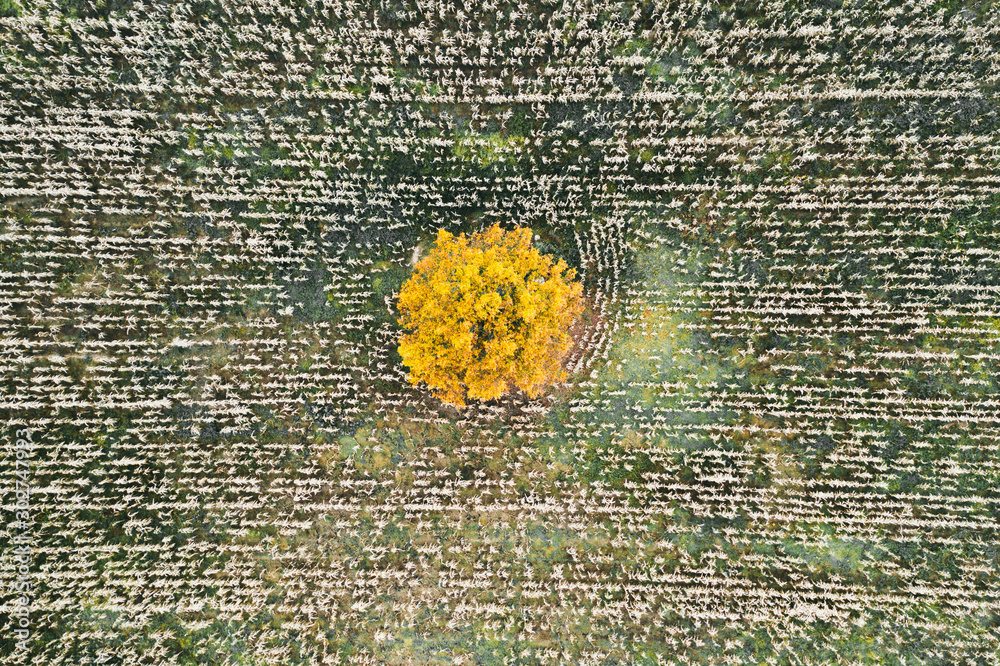 Overhead top down drone shot of a lone tree in the middle of a corn field in autumn.