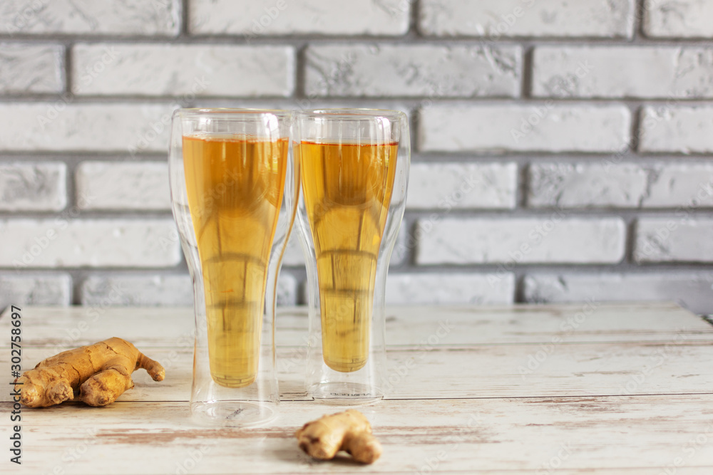 Fresh Ginger Ale with lime and ice or Kombucha in Bottle - Homemade lemon and ginger organic probiotic drink.