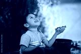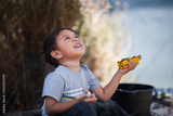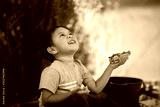 A young boy playing with toys and looking up at the sky and being thankful.