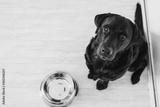 Beautiful black labrador waiting to eat his meal. Home, indoor