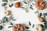Autumn floral frame, web banner. Garland of berry eucalyptus leaves, branches, pear fruit, orange and white pumpkins isolated on white table background. Fall, Thanksgiving design. Flat lay, top view.