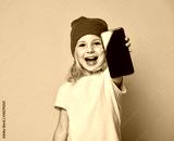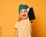 Smiling little girl kid in pink modern hat showing blank screen of mobile phone isolated over white background