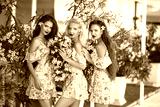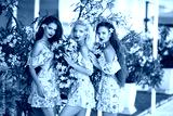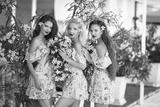 Three beautiful bridesmaid women in a pretty dress with flowers posing over pink blooming flowers background. Fashion photo. Diverse friends concept.