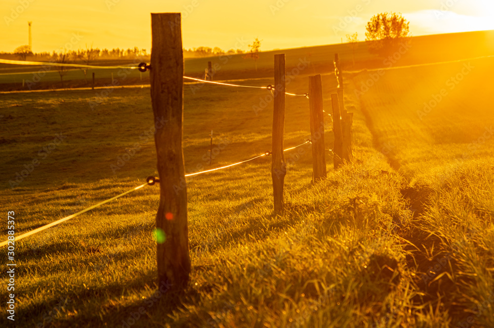 fence posts and wire fence in golden hour sunset light on grass field shot against the sun with selective focus. rural autumn scene in warm sunlight with fence next to agricultural field