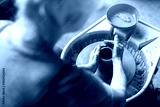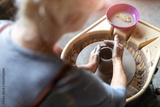 Hand made ceramics are formed by a mature woman on a potters wheel