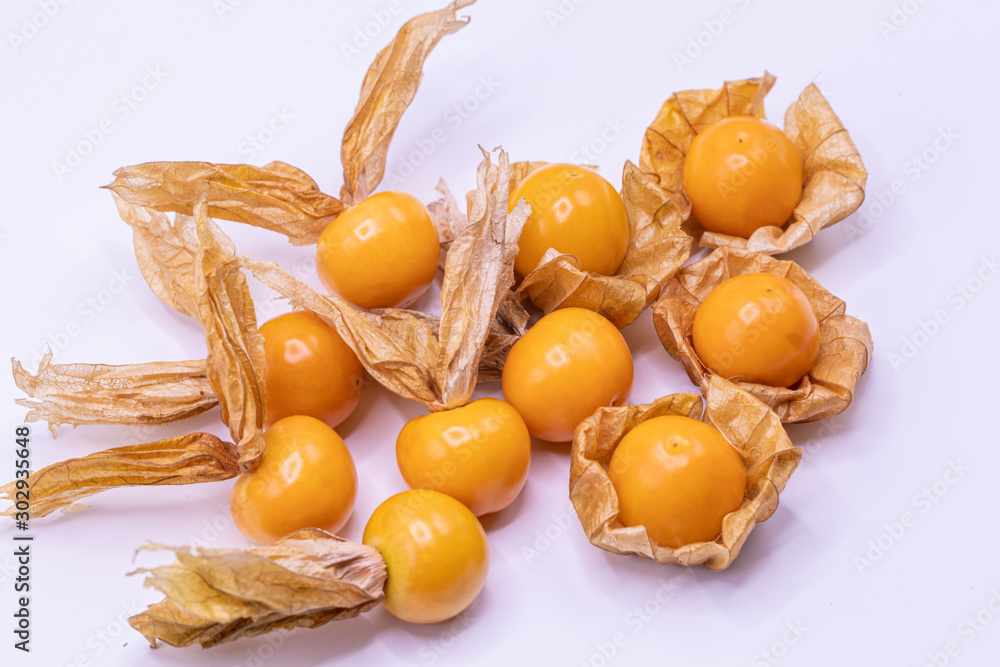 Selective focus close up cape gooseberry fruits (Physalis peruviana)isolated on white background.Commonly called goldenberry, golden berry, Pichuberry.