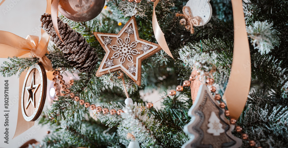 Christmas ball hangs on a decorated fir tree against the background of burning bokeh lights at night.