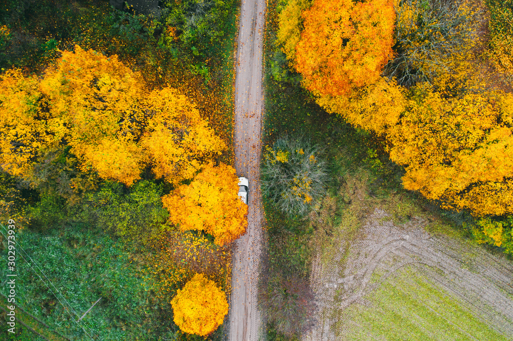 Сar standing under a yellow tree. Beautiful autumn forest. Drone photo. Aerial view