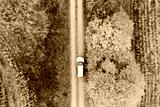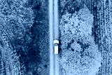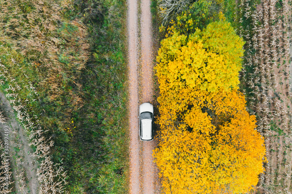 Aerial view of road in autumn forest. Beautiful landscape with rural road, trees with green, red and orange leaves. Drone photography