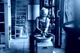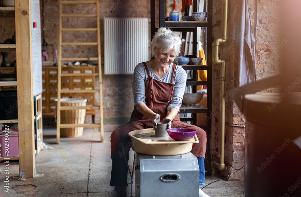 Hand made ceramics are formed by a mature woman on a potters wheel